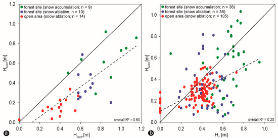 (a) Snow depth measured by UAV (HUAV) compared to the reference snow depth measured at GCP positions (HGCP) at all study sites. (b) Snow depth measured by UAV (HUAV) compared to the reference snow depth measured in a denser network (HT) at all study sites. The dataset in (b) features a significantly higher snow depth variability (R2 = 0.20) than dataset formed by snow depth measurements taken at GCP positions (R2 = 0.60). Graphs show the regression functions (dashed lines) and 1:1 correspondence (solid lines).