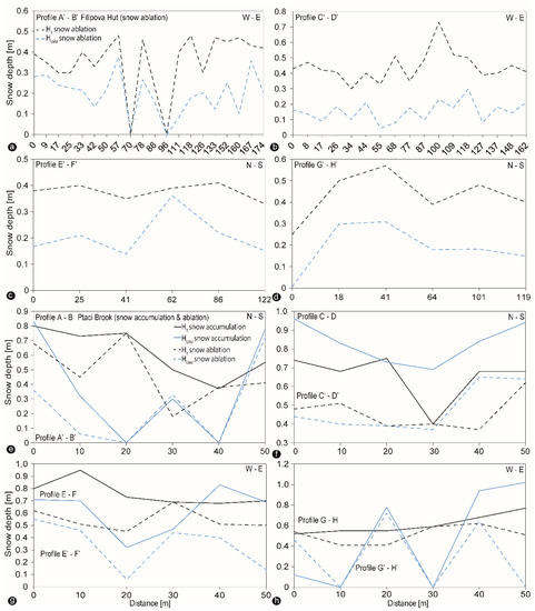 One-to-one (1:1) comparisons between all snow depth measurements (HGCP and HT) and estimated HUAV snow values are provided in Figure 7a,b. The error does not change sufficiently with the snow depth (Figure 7a), showing a moderate overall correlation by all values taken at GCP positions, whereas the overall correlation coefficient is considerably weaker when comparing HT measurements with HUAV estimated snow depth values (Figure 7b). Most of the HUAV snow depth values are underestimated, especially in the open area (Figure 7b). The similar slope of regression line both in Figure 7a,b suggest the relative good robustness of result when using fewer measurement points. However, the much more significant variance in Figure 7b shows that only 10 GCPs cannot capture the variability of snow depth in such complex terrain (many small depressions and elevations due to windthrow, hampered the results). The decision to use a denser grid of arranged ground measurements increased the spatial coverage, snow depth variability and therefore much more confident. In addition to the above consideration, we extracted snow depth profiles of the estimated HUAV measurements from the DoDs (Figure 5d and Figure 6e,f ) and plotted them along with the manual taken HT snow depths (Figure 5c and Figure 6c,d ). Figure 8 shows the produced transects in respectively West-East and North-South directions (four profiles for each snow event in total) during snow ablation at the open site and snow accumulation and ablation at the forest site.