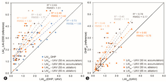 By taking LAI-2200 canopy analyzer and DHP as benchmarks, the correlations between the measured values of the UAV-based LAIeff and the reference values were calculated and plotted in Figure 9a,b. 1:1 relationship across these methods were significant in a few instances. A high relationship was obtained between the two reference methods DHP and LAI-2200 (Figure 9a). The correlations between the UAV-based LAIeff data and LAI-2200 were less strong (Figure 9a). The correlations between UAV-based LAIeff observations and DHP were as good as between both reference methods (Figure 9b). Most of the observed values were all distributed above the 1:1 line (Figure 9a,b). The observed LAI values using UAV and DHP methods were underestimated (Figure 8a). A similar 1:1 relationship was shown in the scatter plot in Figure 9b. The observed UAV values were almost all above the 1:1 line except some values between 0 and 3. In both cases, the observations provided overestimations. RMSE indicates the accuracy of all utilized methods; Figure 9a shows the UAV-based LAI estimation has a lower accuracy comparing to the observed DHP values with LAI-2200 observations. On the contrary, Figure 9b shows a higher accuracy by comparing the UAV and DHP methods.