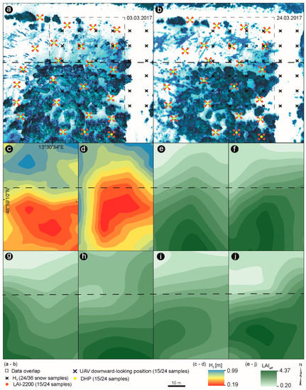 Field plot sampling design. (a,b) Snow depth measurements (HT) taken at 10 m interval during snow accumulation and snow ablation period with visualized ground-based measurements of LAI and UAV downward-looking positions at 24 points. Interpolated HT probes during snow accumulation (c) and ablation (d). Interpolated ground measurements of LAI-2200 (e); digital hemispherical photography (DHP) (f); UAV-based LAIeff at 50 m (g) and 65 m (h) during snow accumulation; UAV-based LAIeff at 50 m (i) and 65 m (j) during snow ablation. All data were interpolated within the data overlap frame, which displays the overlapping area of snow depth sampling (HT) and ground-based measurements of LAI. Different colors indicate different values of snow thickness and LAI values. Black dashed line separates the healthy forest from the bark beetle-infected forest stand.