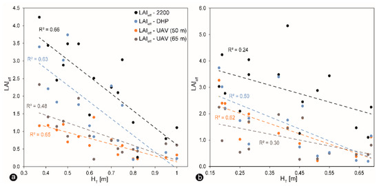 Comparison of effective LAI values produced by LAI-2200 as a reference (plot a; y-axis); hemispherical digital photographs (DHP) as a reference (plot b; y-axis), and UAV (x-axis in both plots) processed in FV2000 and Gap Light Analyzer (GLA) software. Graphs show the regression functions (dashed lines) and 1:1 correspondence (solid lines).