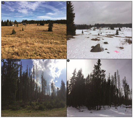 The study covered two different types of small scale localities within the Šumava National Park (ŠumavaNP; Bohemian Forest), Southwestern Czech Republic (Figure 1a). Data from one open area (49°1′32.67′′ N, 13°30′58.38′′ E) with meadow coverage and one forested area (48°59′8.591′′ N, 13°30′30.998′′ E) with dominant Norway Spruce (Picea abies (L.) Karst.), comprising a zone of healthy standing trees and an area of profoundly disturbed forest, were utilized for this study (Figure 1b).