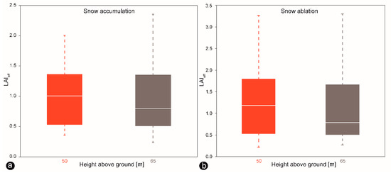 (a) Results of the UAV-based LAIeff estimates. On the y-axes, the effective LAI is marked, and the flight altitude is plotted on the x-axis. The boxes identify the middle 50%, the median, and the maximum standard deviations for LAI points of UAV-based measurements at 50 m and 65 m altitude during snow accumulation. (b) Results of the UAV-based LAIeff estimates at 50 m and 65 m altitude during snowmelt.