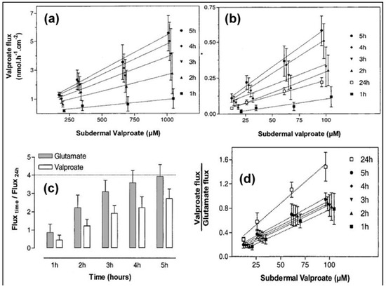 Reverse iontophoretic extraction flux rates of valproate as a function of time and subdermal concentration (a) in the range 209–1050 μM, and (b) in the range 21–104.5 μM. Reverse iontophoretic extraction flux rates of valproate and glutamate as a function of time relative to their values at 24 h. (c) Ratio of the reverse iontophoretic extraction flux rates of valproate and glutamate as a function of time and subdermal valproate concentration (range 21–104.5 μM). (d) Each data point represents the mean ± standard deviation (n = 6) [17].