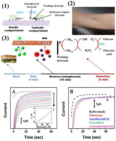 A transdermal biosensing approach involving temporary tattoo-based epidermal diagnostic device combining reverse iontophoretic extraction of interstitial glucose and enzyme-based amperometric biosensor has been recently developed [21]. This reverse iontophoretic biosensing system involves a specific type of electrode rather than the typical three-electrode electrochemical biosensing approach. The system involves anodic and cathodic parts, each of which consists of an Ag/AgCl reference electrode with reverse iontophoretic working and counter electrodes.