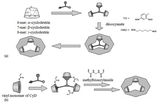 Molecular imprinting of cyclodextrins as receptors of nanometer-scaled templates. (a) The cyclodextrin is cross-linked by diisocyanate, in dimethylsulfoxide, in the presence of the template. (b) The vinyl monomer of cyclodextrin is copolymerized with methylenebisacrylamide, in water, in the presence of the template [22].