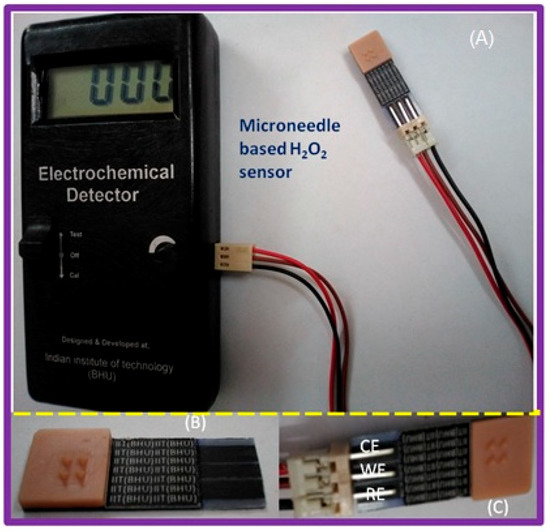 Construction of microneedle assembled screen-printed electrode (SPE)-based amperometric sensor for hydrogen peroxide. (A) Electrode assembly connected to a dedicated electrochemical detector; (B) Microneedle assembled SPE in three electrode configuration; (C) Electrode connector fixed to SPE: WE = working electrode, RE = reference electrode and CE = counter electrode) [26].