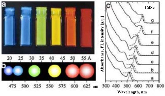 Size-dependent absorption and emission spectra of CdSe semiconductor nanocrystals with various sizes. (a) Size-dependent luminescence color and (b) schematic presentation of size, color, and emission wavelength of CdSe–ZnS QDs. (c) Absorption (solid lines) and emission (broken lines) spectra of CdSe QDs with various sizes [33].