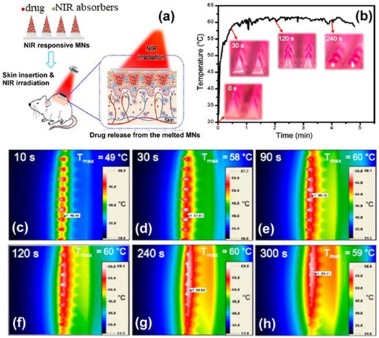 Targeted drug release using the microneedle technology has evolved recently as a second generation of minimally invasive means of transdermal drug delivery. Chen et al. reviewed NIR laser irradiation-triggered release of a drug from the microneedles at a directed site [35,36,37,38]. When the microneedles were irradiated with NIR light, the mobility of polymeric chains in the microneedles enabled drug release; the release was terminated when laser light was removed. The microneedles offer an effective means for drug administration in the body; the system is repeatedly switchable, which enables release of a consistent dosage of the drug.