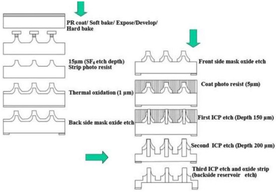 Fabrication process of hollow silicon out-of-plane microneedles [41].