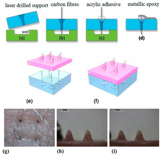 Schematic showing steps (a–f) used for assembly of the microneedle device. Images of microneedle array and cadaveric porcine skin after microneedle insertion. (g) Optical micrograph showing delivery of trypan blue into microneedle-fabricated pores within cadaveric porcine skin scale bar 1 = mm. (h) Optical micrograph showing hollow microneedles before insertion into cadaveric porcine skin. (i) Optical micrograph showing hollow microneedles after insertion into cadaveric porcine skin [42].