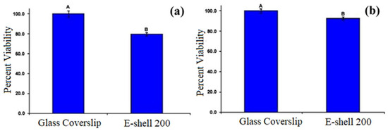 MTT viability data for cells grown on e-shell 200 acrylate-based polymer and glass cover slip. (a) MTT viability of human epidermal keratinocytes grown on e-Shell 200 acrylate-based polymer compared to glass cover slip. A and B denote statistical differences p < 0.05 between the polymer and the control. (b) MTT viability of human dermal fibroblasts grown on e-Shell 200 acrylate-based polymer compared to glass coverslip. A and B denote statistical differences p < 0.05 between the polymer and the control [42].