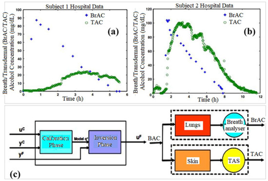 Breath and transdermal data for (a) Subject 1 and (b) Subject 2. (c) Two phase design of the data analysis system (left) and the blood/lung/breath analyzer and blood/skin/TAS systems (right) [44].