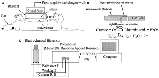 Lee et al. examined transdermal sensing of glucose on the abdominal skin of rats, following permeablization of the skin with ultrasound [50]. A cymbal ultrasound array was applied to the abdominal area of the rats, delivery a low frequency (20 kHz) signal; this approach aided in the permeablization of the skin for sampling of interstitial fluid.