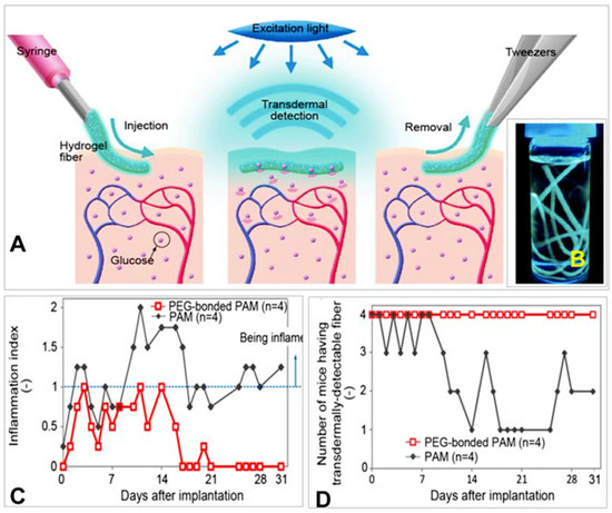 - Heo, Y.J.; Shibata, H.; Okitsu, T.; Kawanishi, T.; Takeuchi, S. Long-term in vivo glucose monitoring using fluorescent hydrogel fibers. Proc. Natl. Acad. Sci. USA 2011, 108, 13399–13403. [Google Scholar] [CrossRef] [PubMed]