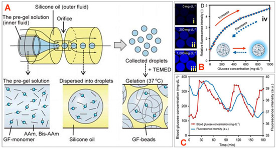 - Shibata, H.; Heo, Y.J.; Okitsu, T.; Matsunaga, Y.; Kawanishi, T.; Takeuchi, S. Injectable hydrogel microbeads for fluorescence-based in vivo continuous glucose monitoring. Proc. Natl. Acad. Sci. USA 2010, 107, 17894–17898. [Google Scholar] [CrossRef] [PubMed]