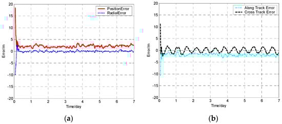Orbit determination errors of SV-01 by the increased measurement covariance extended Kalman filter (IMCEKF) algorithm. (a) the position error and radial error; (b) along track error and cross track error.