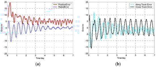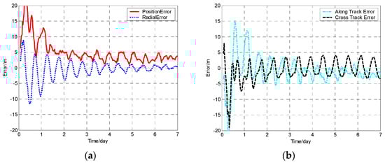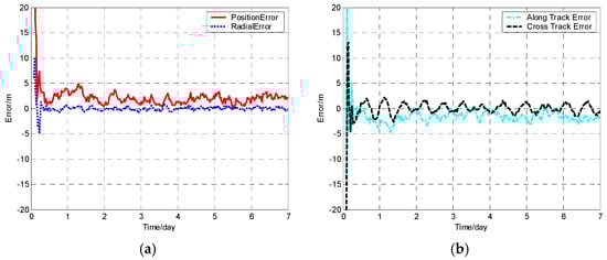 Orbit determination errors of SV-01 by the balanced extended Kalman filter (BEKF) algorithm. (a) the position error and radial error; (b) along track error and cross track error.