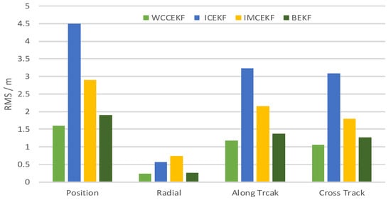 For each method, the orbit determination errors tended to oscillate steadily after poor initial results. However, differences can be observed among the four algorithms. To have quantitative comparisons, the root mean square (RMS) of different errors for all the satellites in the constellation was calculated for the stable section. The average RMSs were then obtained by averaging the data from all the satellites and are plotted in Figure 5. It is worth pointing out that the average RMS of position error for the WCCEKF, ICEKF, IMCEKF, and BEKF algorithms was around 1.6 m, 4.5 m, 2.9 m, and 1.9 m, respectively.