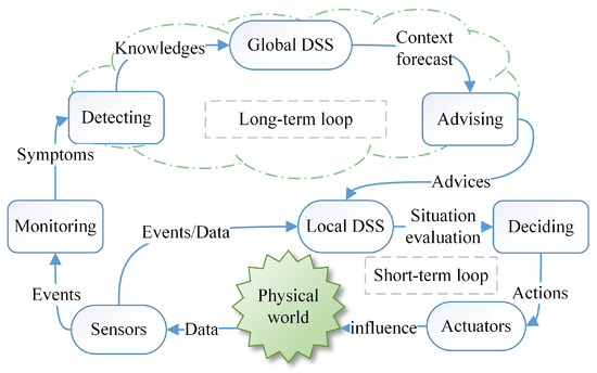Figure 13. The conceptual solution integrates a simulation-based decision making and evaluation, contract-based self-management, and multi-object optimization based (distributed) scheduling. This solution includes three main feedback loops. One loop is between global DSS and local DSS, the second loop is local DSS between sensors or actuators, and the third loop is between sensors, actuators and the physical world. Based on the three loops, SCPS can form a complete feedback loop between physical space and cyber space. The global DSS can simulate both the physical space and cyber space (especially the sensors and actuators), then select several best simulation results as the self-management decisions and generate the contract. The local DSS selects the advices/contracts best fitting to its situation, decomposes the contracts based on multi-object optimization, and coordinates subsystems based on multi-object scheduling with sub-contracts. The sensors and the actuators follow the sub-contracts and process self-management strategies in a decentralized way. This conceptual solution can also provide life-cycle dependability management, and improve the efficiency of development and traceability of management.