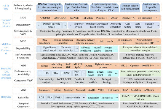 To develop a dependable SCPS and to guarantee its dependability through the whole life cycle, we should comprehensively apply various technologies at different levels. Here, we summarize the popular (and potential) methods and frameworks from thousands of papers, classify them into four domains: correctness V&V methods, self-adaptation solutions and V&V methods, dependability and V&V methods, MDE solutions (toolsets), at five main levels: (1) hardware level (nodes and network devices), (2) basic software level (operating system and network protocols), (3) middleware and framework, (4) domain/aspect oriented solutions, (5) the all-in-one solutions. Considering the readability, we select part of the results, which are illustrated in