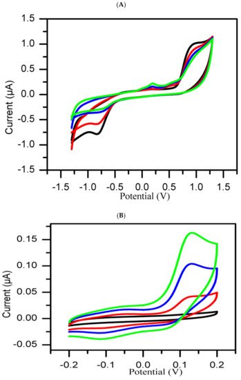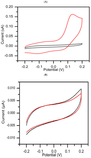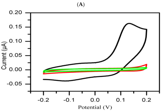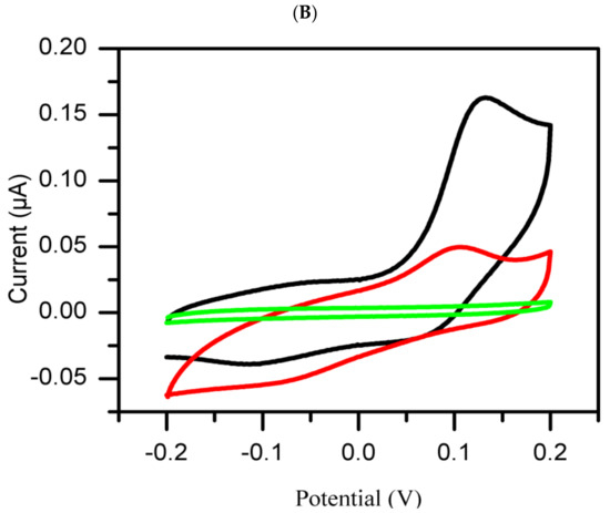Comparative analysis of representative CVs of each group: Inactive extract (A, red curve) and active extract (B, red curve) with negative control (black curve) and positive control (green curve).