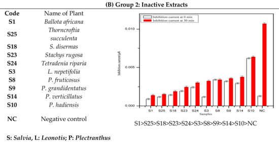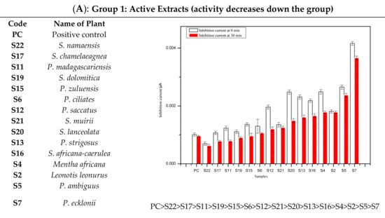 Based on the cyclic voltammogram experimental results, the inhibitory activity potential of methanolic extract of each plant against tyrosinase enzyme was classified as either positive or negative compared to the CVs recorded for the standard kojic acid as positive control or DMSO as negative control. Accordingly, inhibitory behavior is termed “positive” when the inhibition current (Iinh) decreases with time and as “negative” with (Iinh) increases with time. The inhibitory activity of each extract using the CV was monitored and recorded based on time difference between 0–30 min, and the addition of substrate to a mixture of extract and enzyme in buffer. Extracts are classified into two groups: Group 1 (active extracts) and Group 2 (inactive extracts):