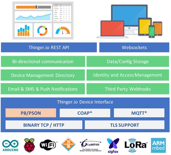 23]. As we will see later, Thinger.io has been designed for the use of a highly optimized protocol that reduces the delay when sending information to the cloud, saves bandwidth, reduces memory space and saves the device’s battery.