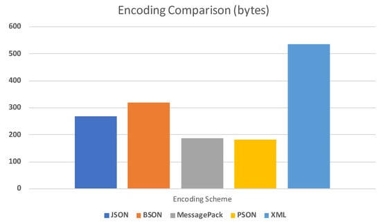 Figure 2 provides a comparison of encoding sizes between different common formats used by platforms, such as JSON, BSON (Binary JSON), MessagePack, XML, and the proposed PSON, which performs slightly better than the most efficient alternative (MessagePack), which is not quite common in the IoT domain. As such, the proposed solution reduces latency while sending information to the cloud, saves bandwidth, reduces memory footprint, and save battery by offering efficient protocols and an encoding mechanism.