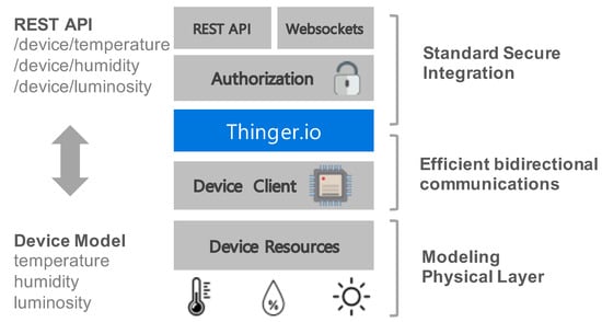 Figure 3 illustrates this use case, where a device contains a set of sensors (temperature, humidity, luminosity) that are defined in the device model. Using the Thinger.io client libraries, the device can connect to the Thinger.io cloud, using efficient bidirectional communications. Once the device is connected, the resources defined in the model can be accessed in real time from the automatically generated REST endpoints, like