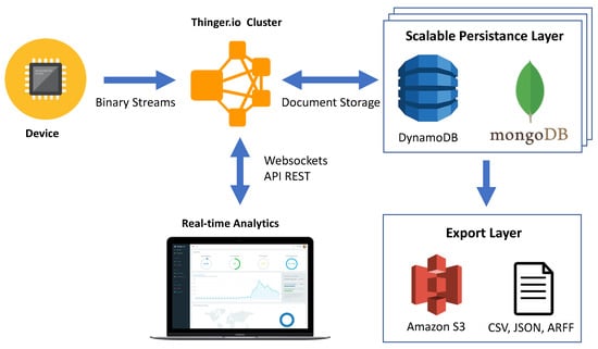 19]. This involves working with optimized network protocols to work with sensors with limited resources, dealing with the scalability of computing architectures to support the concurrent connection of millions of devices and the availability of permanent access required by such devices. In addition, it is necessary to think of standard forms of communication between devices, self-discovery, etc. In this way, devices from different manufacturers can interact with each other to generate the expected intelligent behavior. Thinger.io has been designed to allow connectivity to a large number of devices, and its connectivity capacity is now growing due to its open nature.