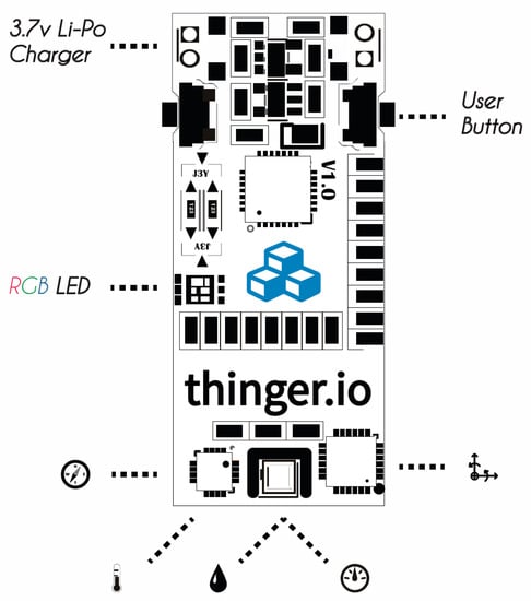 For the development of this case study, a hardware device of the Thinger.io platform will be used, called ClimaStick, which integrates both the sensors and Internet connectivity. This device will allow us to collect weather information over time, without having to have knowledge of electronics, data buses, sensors, etc. The device is based on an Espressif ESP8266 microcontroller, which has a Cortex M0 at 80 Mhz, 4 MB of flash, and 160 KB of RAM. This board also has 802.11 b/g/n WiFi connectivity for its Internet connection, as well as serial port interfaces through USB that allows its programming through the Arduino development environment. The development plate has small dimensions of 37 × 17 × 5 mm (