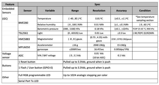 This board integrates sensors that allow measuring the temperature, relative humidity, barometric pressure, or brightness, necessary for the development of the practical case. It also integrates other sensors, such as a magnetometer, an accelerometer, and a gyroscope, which can be useful for other practical cases where it is necessary to have inertial sensors. The sensors used by this device, as well as its operating ranges, resolution, and accuracy, are specified in