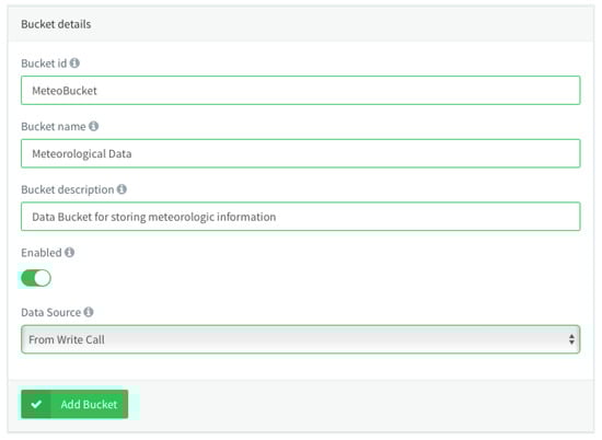 Add Bucket button in the data bucket list, which will open a section to configure the information store. In the same way as with the device, it will be necessary to assign an identifier of the data bucket, i.e., a name and a description, if we want to activate it, or the source of data from which the information will be taken. In this case, we will create a data bucket with the identifier