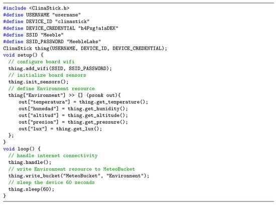 In this section, we will show how to model the behavior of physical devices so that they send the information to their corresponding data bucket. In this way, once the platform has been configured to support the connection of a new device, and a data bucket has been created to store the data, it is necessary to program the device to connect to the platform, read the information of the sensors, and write in the data bucket. The programming of the device will be done through the Arduino environment, for which it is necessary to carry out some adjustments to use the ClimaStick libraries, and allow the programming of the ESP8266 microcontroller on which it is based. This initial process is documented in detail within the platform documentation at