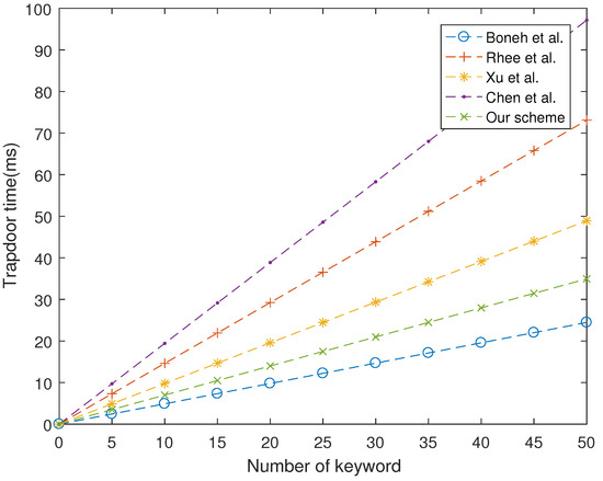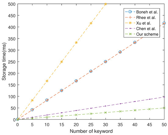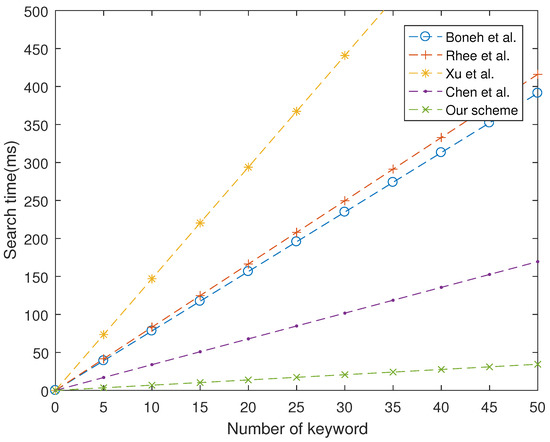 As shown in Figure 1, Figure 2 and Figure 3, our proposed scheme is the most efficient in storage phase and search phase. In trapdoor phase, our proposed scheme has a higher computational cost than that of Boneh et al. [7], although it is still lower than other schemes. In summary, the performance of our proposed scheme is more efficient than four schemes studied in [7,24,26,28].