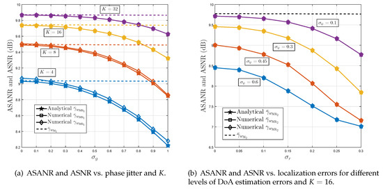 Figure 2 plots the ASANR and ASNR achieved by the proposed beamformer in monochromatic (i.e., scattering-free) environments versus the variances of channel errors , , and for different values of K. Figure 2a considers implementation Option 1 which results in a phase jitter while Figure 2b considers implementation Option 2 which results in localization and DoA estimation errors. We observe from these figures that the analytical and empirical curves of and match perfectly thereby validating the correctness of the derivations in Section 4. Furthermore, we notice that the ASNR and ASANR curves remain very close for or coincide almost perfectly otherwise, thereby proving the insightfulness of the ASANR metric. As far as the proposed M-RDCB performance is concerned, it is able to achieve optimal performance, even for small K, when the channel estimation errors are relatively small to moderate (i.e., in Option 1 or and in Option 2). This confirms the robustness of the new M-RDCB. For extremely large errors, however, it looses only a fraction of a dB. Actually, with the advances made during the two last decades in the field of phase synchronization, localization, and DoA estimation, these channel estimation errors are often very small, making our beamformer’s performance optimal if advanced parameter estimation algorithms are adopted. Nevertheless, the latter naturally come with increased complexity and cost, which certainly burden those of WSN nodes. In this context, the proposed M-RDCB offers the possibility of using inaccurate but low-cost estimation algorithms at negligible performance losses, making it a more appealing and practical for cost-effective WSN deployment in real-world conditions. All these observations corroborate all the results of Section 3.