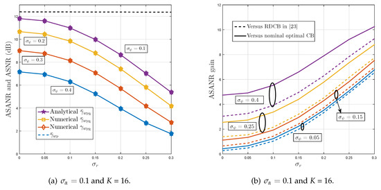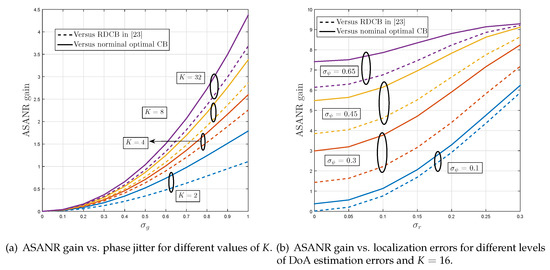 Figure 3 displays the achieved ASANR gain of proposed M-RDCB against the nominal optimal DCB and the M-RDCB in [32] for different values of K. Figure 3a considers the first implementation option while Figure 3b considers the second. We observe from these figures that M-RDCB largely outperforms both benchmarks for any given K, , , and . For instance, when Option 1 is adopted, it achieves for ASANR gains of and dB against the nominal optimal DCB and RDCB in [32], respectively. If Option 2 is adopted, these ASANR gains increase, respectively, to as much as and dB when and . As could be observed from Figure 3, these gains increase rapidly with both K and channel estimation errors. These observations corroborate all the results of Section 4 and verify the net superiority of robust M-RDCB techniques in scattering-free environments.