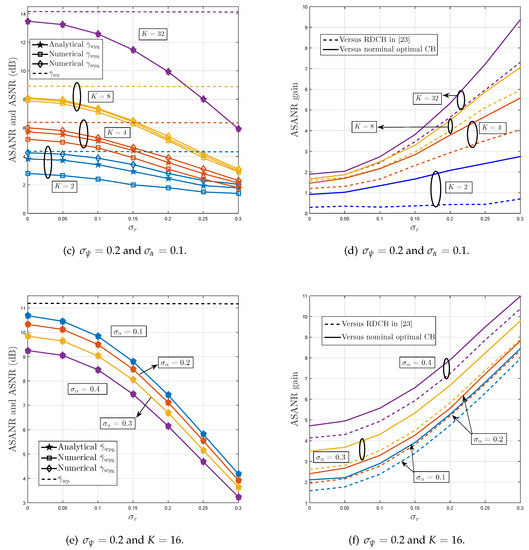 Figure 4 shows the ASANR, ASNR, and the ASANR gain of the proposed P-RDCB in polychromatic (i.e., scattered) environments. Figure 4a,c,e plot its achieved ASANR and ASNR versus K, , , and while Figure 4b,d,f compare its achieved ASANR with those of the nominal optimal DCB and RDCB in [32]. As expected, approaches the optimal ASANR performance level even in polychromatic environments, and that is for all tested AS values. In such environments, achieves ASANR gains of until and dB against both benchmarks, respectively. As can be observed from Figure 4b,d,f these gains increase rapidly with both K and channel estimation errors. For instance, according to Figure 4f, the ASANR gain over the two benchmarks increases by approximatively against both when is twice as large or and , respectively, when is four times as large. These additional observations further verify the high robustness of the proposed P-RDCB against channel estimation errors, key practical feature that allows its cost-effective integration in real-world WSN applications. Again, according to Figure 4, we verify that the analytical and empirical values of match perfectly when or are very close otherwise. All these observations corroborate once more the discussion of Section 4.
