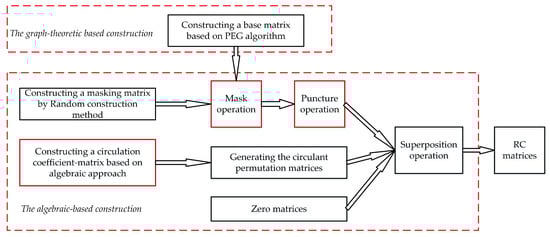 Most methods for constructing LDPC codes can be classified into two general categories: the algebraic-based and the graph-theoretic-based constructions []. This paper combines these two methods to construct the RC-LDPC codes, as shown in Figure 1.