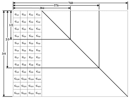 The fast-coding method uses the special structure of the QC-LDPC code for encoding, so the check matrix and the generator matrix need to be set. The structure of the check matrix is shown in Figure 3. The base matrix size is , and the check matrix is divided into 64 blocks, and the size of each block matrix is . The numbers in the above matrix represent the element coefficients of the current matrix, and the matrix with a coefficient of 0 is the all-zero matrix. The numbers in the below matrix represent the circulant coefficients of the current matrix, and a coefficient of 0 indicates that the current matrix is not shifted.