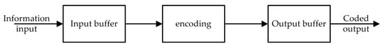 The encoder-coding block diagram is shown in Figure 5. It is divided into three parts. The input buffer part is used to buffer the information transmitted by the upper level and output the data when the encoding part is needed. The second part is the encoding part, which is used to calculate the encoding result and output the calculation result to the output buffer module. The output buffer part is used to store the encoding result and the communication with the downstream module.