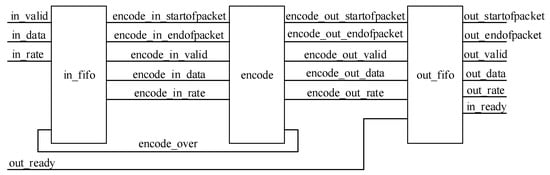 The output module mainly performs the function of storing the encoded result and communicating with the downstream module. The encoding module inputs the encoding result to the output module. When the “out_ready” signal is high, it indicates that the next level has been prepared for reception, and the encoding result may be output; otherwise, the output module temporarily stores the encoding result. When the output module is full, the output “in_ready “signal is turned low, indicating that new data cannot be accepted. Therefore, the output module mainly contains the fifo module and the corresponding control module.