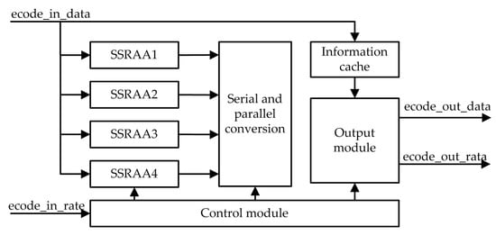 The SSRAA operation module completes the coding operation process, and the four sets of SSRAA operation modules work in parallel, which improves the coding efficiency. The parallel–serial conversion module converts the verification sequence encoded by the four parallel SSRAA circuits into a serial form for sequential output. The source information cache module is used to store the source sequence. The output module mainly completes the output of the encoded result.