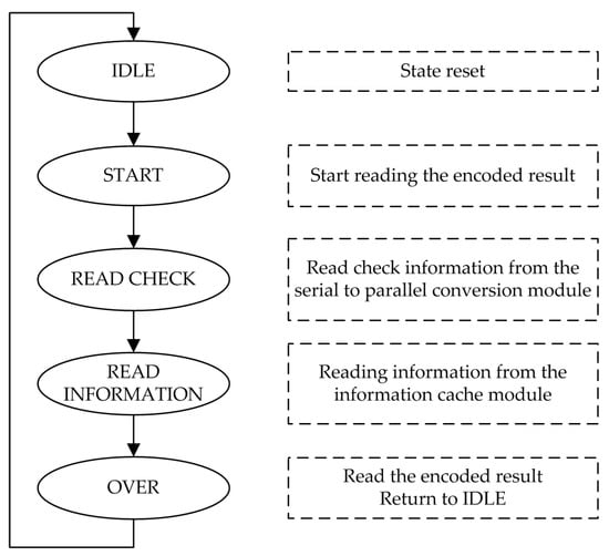 After the encoding is completed, the state machine jumps from the original IDLE state to the SRTART state and begins reading the encoded result. In the READ_CHECK state, the output module reads the parallel-converted 192-bit check sequence from the parallel-to-serial conversion module and then jumps to the READ_INFORMATION state. In the READ_INFORMATION state, the output module reads the source information of the corresponding length from the information cache module according to the code rate information of the current frame, and completes the output of the encoded result. The state machine then jumps back from the OVER state to the IDLE state, waiting for the encoding of the next frame to complete.