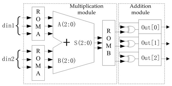 The multiplication and addition operations in the encoding of the NB-LDPC code are operations of the Galois field. For an 8-ary LDPC code, each symbol consists of three bits. The addition of the Galois field is essentially a bitwise XOR operation, as shown in the right part of Figure 10. The multiplication of the Galois field is designed by the looking-up table method, as shown in the left part of Figure 10. First, the input data din1 and din2 are respectively looked up in the ROMA, the result is added in the eight-element domain, and the addition result is checked in the ROMB. The result is the multiplication of din1 and din2 in .