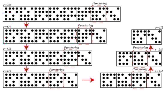 The puncturing technique is the most common rate adaptive technique [,,], the implementation process of which first selects a high rate mother code with excellent performance, then punctures the check bit in the code word, thus deleting a number of columns in the check matrix, resulting in a low rate code word. The high rate QC-LDPC code may be used at higher SNR. On the contrary, when the channel environment is poor, a low rate QC-LDPC code may be used, thereby improving the average effectiveness of the communication system. Using the puncturing technique to change the degree distribution of the masking matrix, an adaptive-rate LDPC code can be obtained. Since the dimension of the masking matrix is much smaller than the check matrix of the QC-LDPC code, it can greatly reduce the hardware complexity of the rate-adaptive communication system.