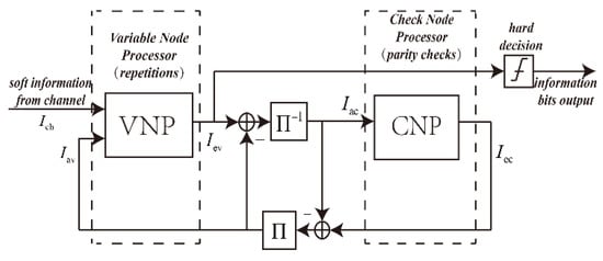 LDPC codes are currently among the most promising coding techniques to achieve the channel capacities for a wide range of channels. LDPC codes were first proposed by Gallager in 1962 [], and developed in the late 1990s [,]. Since their rediscovery, a great deal of research has been conducted in design, construction, encoding, and decoding algorithms. Many LDPC codes have been adopted as standard codes for current and next-generation communication systems, such as wireless, optical, satellite, deep space, multi-media broadcast (MMB), digital video broadcast (DVB) systems [,,], and so on. This rapid dominance of LDPC codes in applications is due to their capacity-approaching performance, and they can be achieved with practically implementable iterative decoding algorithms. However, further research is needed to better understand the structural properties and performance characteristics of these codes. QC-LDPC codes, a subclass of LDPC codes [], can be efficiently encoded and decoded by shift register adder accumulator (SRAA) [,] and semi-parallel decoding architectures [,], respectively. Thus, QC-LDPC codes can greatly reduce the consumption of hardware resources, and solve the complicated problem of implementing the codec from a certain angle.