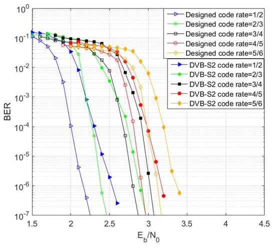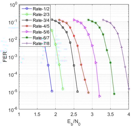 For the B5G mobile system, the channel-coding scheme for a high data rate is pursued; however, the wireless channel environment is time-varying and fading. High-data-rate signals are prone to inter-symbol interference (ISI) in frequency-selective fading channels, which affects the overall transmission performance of the system []. In order to improve the throughput of the system, the adaptive coding method is proposed []. This method dynamically adjusts the coding mode of the transmitted signal according to the channel state information (CSI) fed back from the receiving end, and then finds a balance between the transmission rate and the transmission reliability to improve the throughput of the system. The DVB-S2 standard adopts an adaptive coding modulation (ACM) scheme in which channel coding comprises LDPC codes [,]. However, the parameters such as the code length and the rate of LDPC codes in the DVB-S2 standard are fixed, and LDPC codes of different parameters need to design corresponding check matrices, resulting in the consumption of hardware resources.