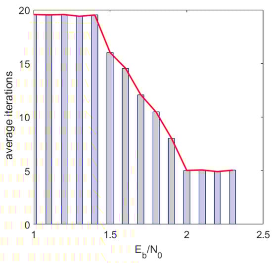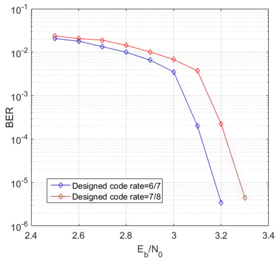 The coding complexity is shown in Table 1. Since the check matrix construction algorithm for constructing the QC-LDPC code based on the masking and puncturing technique has a quasi-cyclic structure, an encoding method of a quasi-cyclic code with low coding complexity can be employed. From the perspective of coding complexity, adopting the QC-encoding algorithm, only needs to multiply times in , and there is no need to add operations throughout the coding process— and are the number of rows and columns of the mask matrix , respectively, and is the dimension of the sub matrix. Linear complexity coding is achieved when high-speed coding is employed. The coding complexity calculation of the random construction algorithm of the NB-LDPC code check matrix consists of two parts: one is to Gaussian eliminate the check matrix into the structure of the lower triangular matrix, that is, pre-process the check matrix; the operation complexity is , where is the code length. The other part is that the coding complexity is . This is because the coding complexity of the coding algorithm depends on the sparsity of the generator matrix. Let the average column weight of the generator matrix be ; approximately, multiplication operations and sub-operations in are required throughout the encoding process. Although the check matrix of a NB-LDPC code is very sparse, its generator matrix is not sparse. Usually, the ratio of and is a non-negligible constant, which often makes the coding complexity proportional to the square of its code length. From the hardware storage capacity of the check matrix, when storing the matrix with this construction algorithm, only one unit array , one non-binary coefficient matrix , and one circulation coefficient matrix are stored. However, to construct a parity check matrix of the same size using a random construction method, it is necessary to store a check matrix. The hardware storage resource is largely saved compared with the storage of the complete NB-LDPC code check matrix.